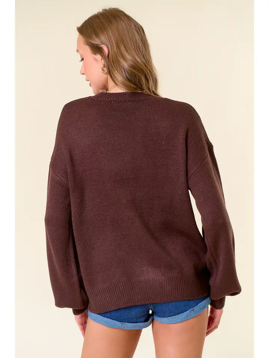 HELLO FALL EMBROIDERED OVERSIZE SWEATER - CHOCOLATE