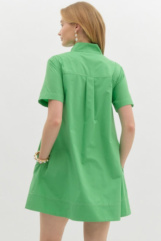 HIGH NECK PLACKET BUTTON MINI DRESS - GREEN