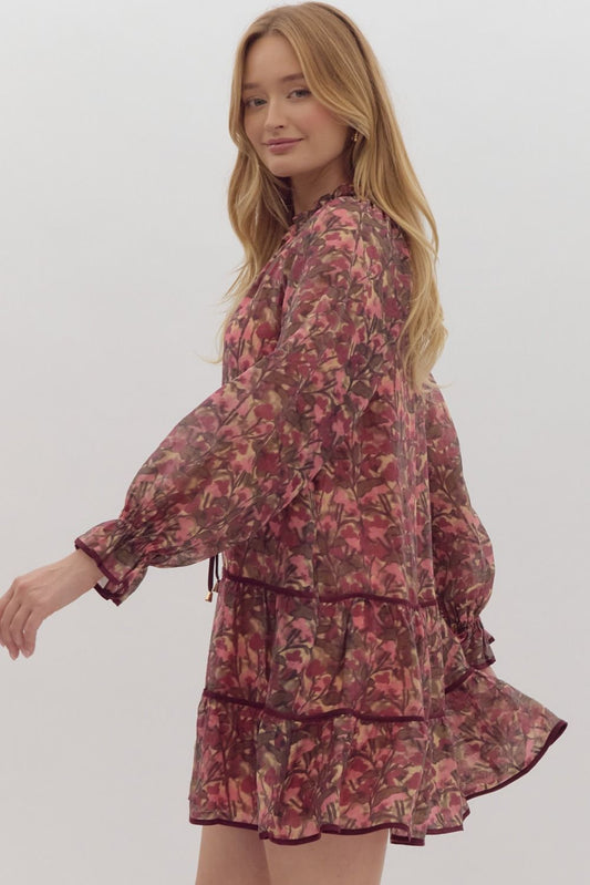 LONG SLEEVE TIERED DRESS, PINK FLORAL