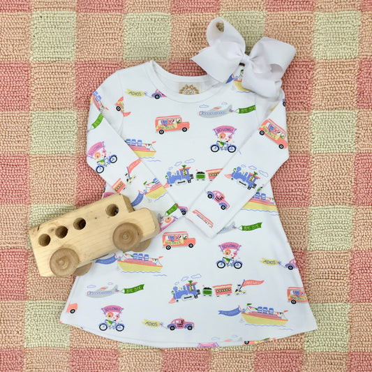 LONG SLEEVE POLLY PLAY DRESS - HAPPY TRAVELS