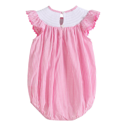 PINK STRIPED FLAMINGO SMOCKED FLUTTER ROMPER