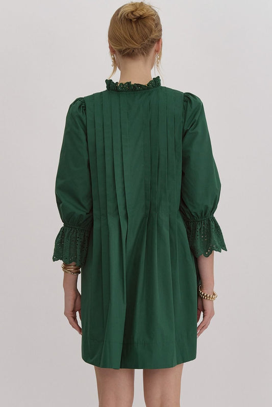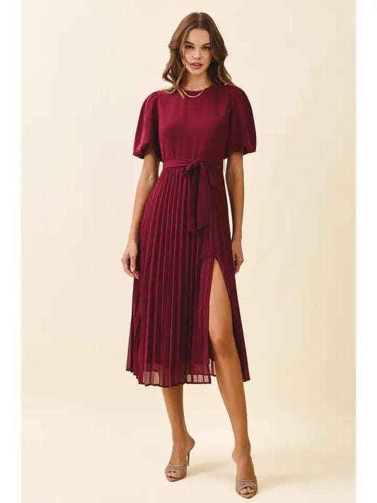 PLEATED WITH SIDE SLIT DETAIL ROUND NECK DRESS - BURGUNDY
