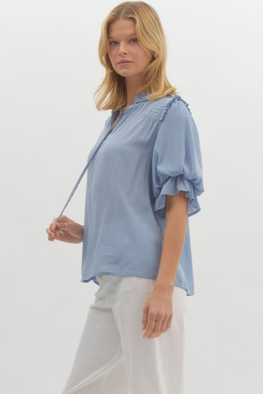 Sold outPLEAT ACCENT SHOULDER TOP - CHAMBRAY