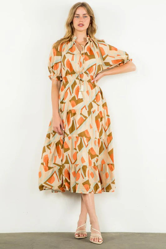SMOCKED WAIST PRINT MAXI DRESS - ORANGE