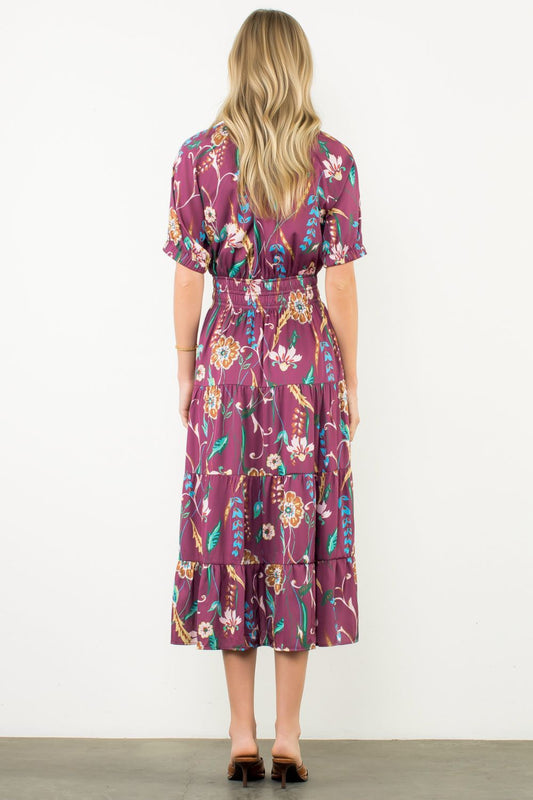 SMOCKED WAIST TASSEL FLORALMAXI DRESS - BURGUNDY