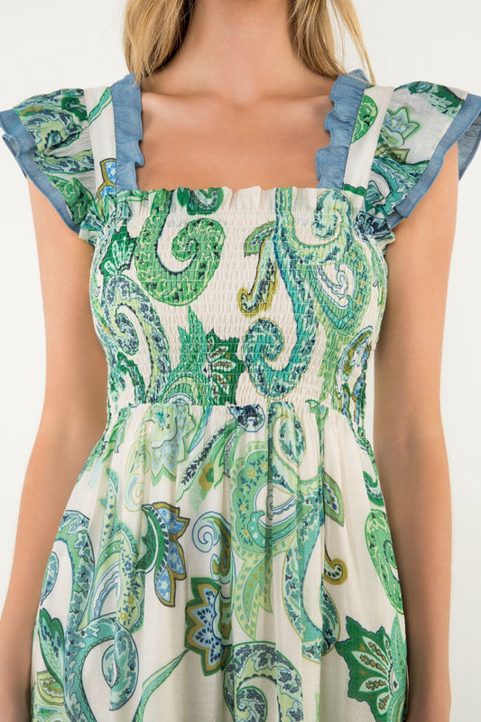 SMOCKED FLUTTER SLEEVE PAISLEY PRINT MAXI DRESS - GREEN