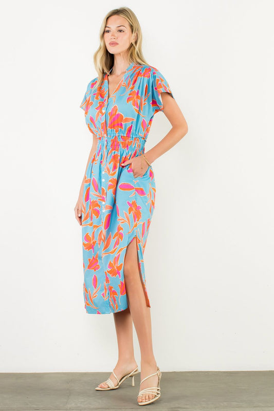 SMOCKED WAIST BUTTON DOWN FLORAL DRESS - LIGHT BLUE