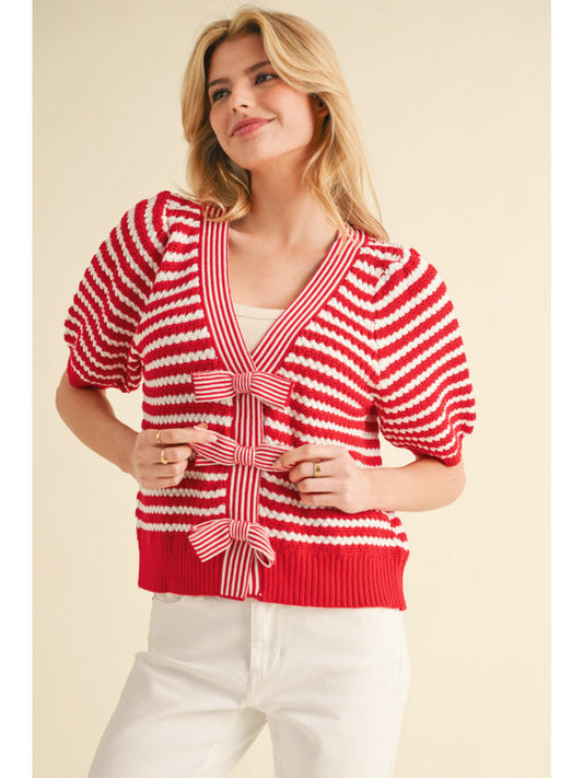 STRIPE KNIT BOW CARDIGAN - BLACK