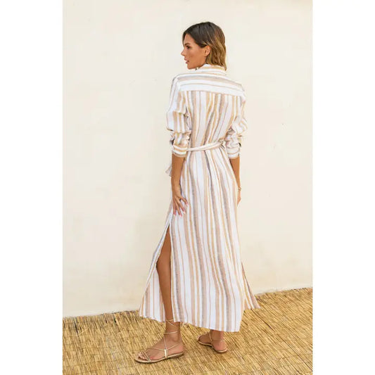 STRIPED BELTED MAXI SHIRT DRESS - BIRCH BROWN