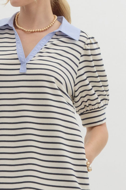 STRIPE V NECK COLLARED MINI DRESS - OFF WHITE