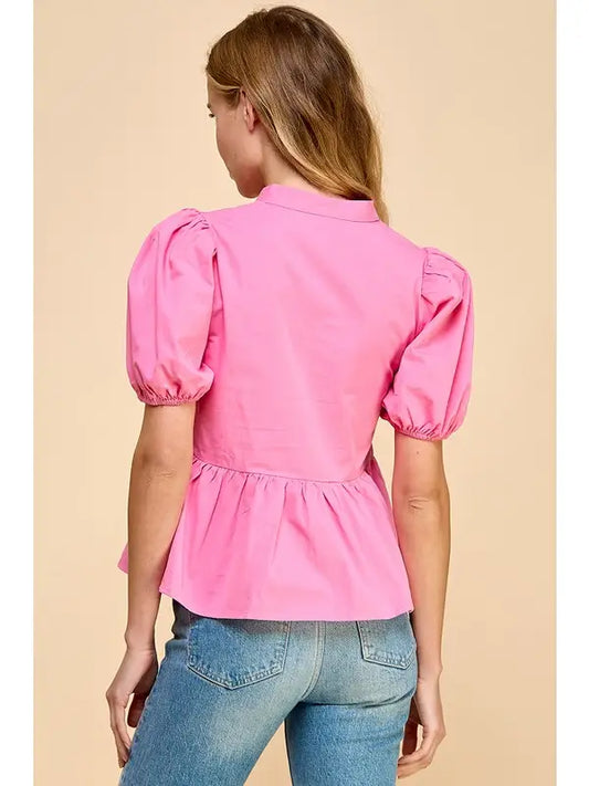 V NECKLINE PUFF SLEEVE TOP - PINK