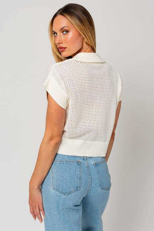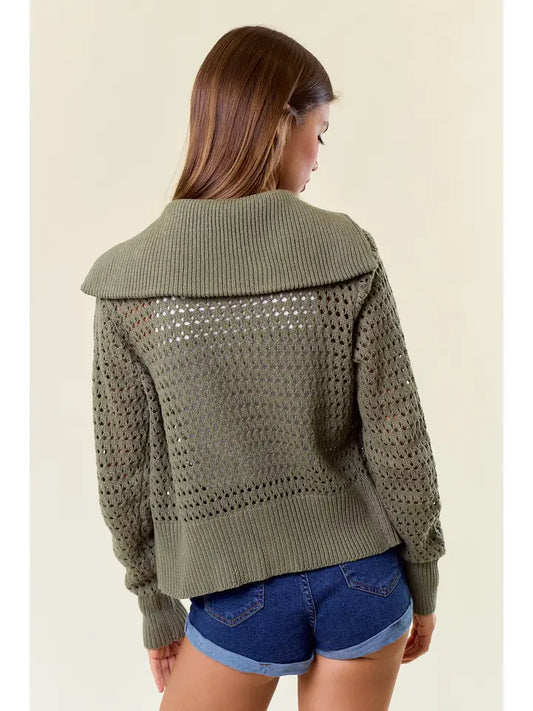 ZIP UP POINTELLE OPEN KNIT SWEATER - OLIVE