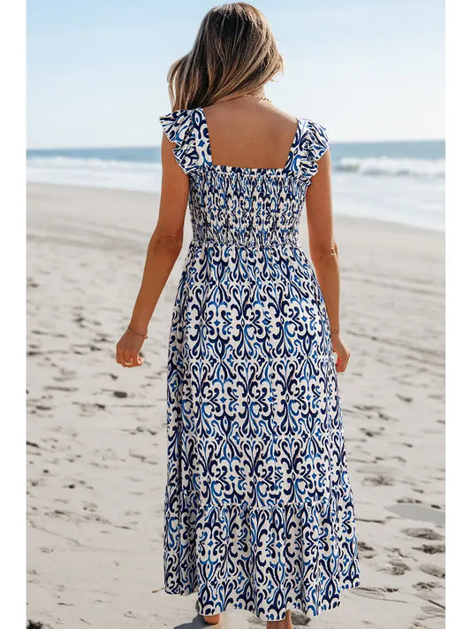 BOHO PRINT SQUARE NECK SHORT SLEEVE MAXI DRESS