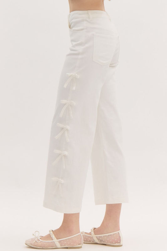 CROPPED MID-RISE DENIM JEANS W/BOWS - WHITE