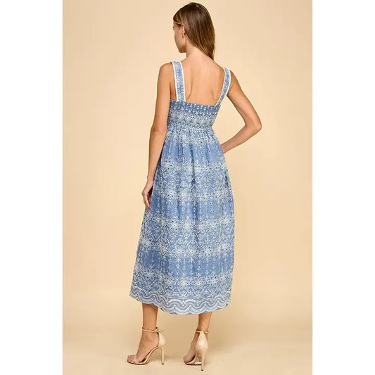 EMBROIDERED FLORAL EYELET MIDI DRESS - BLUE