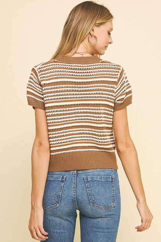 Sold outEYELET STRIPE SWEATER - BROWN/IVORY