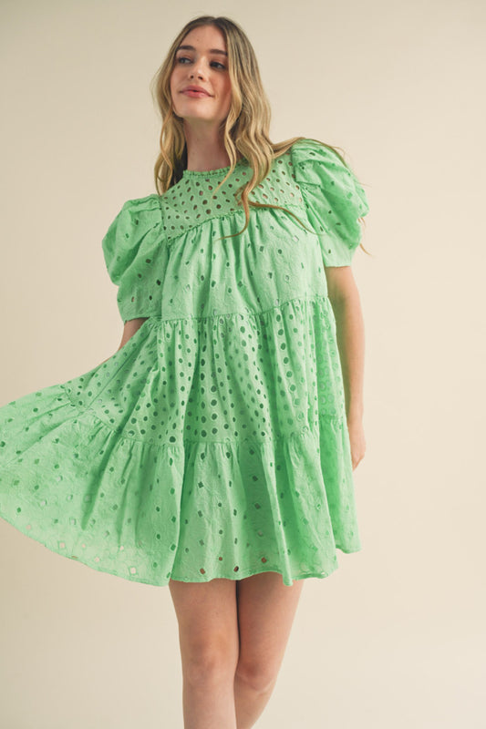 EYELET BABYDOLL MINI DRESS - APPLE GREEN
