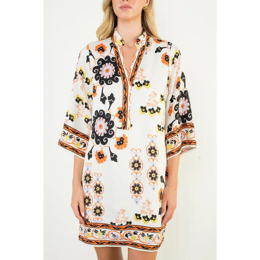 FLORAL BORDER PRINT SPLIT NECK TUNIC DRESS - WHITE