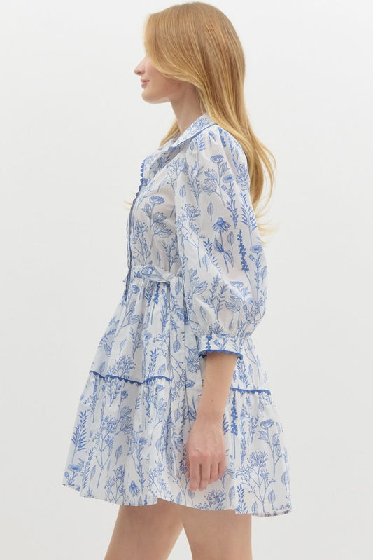 FLORAL 3/4 SLEEVE TIERED MINI DRESS - BLUE