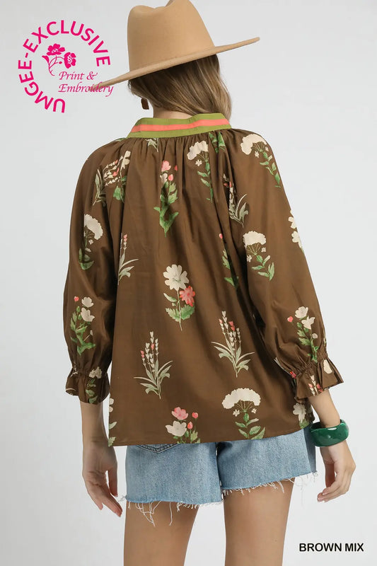 FLORAL CONTRAST TRIM BLOUSE - BROWN MIX