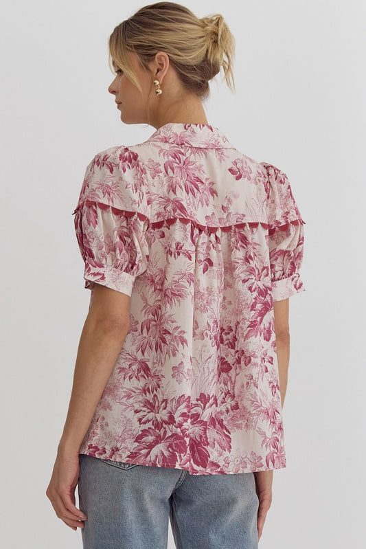 FLORAL V NECK PUFF SLEEVE TOP - MERLOT