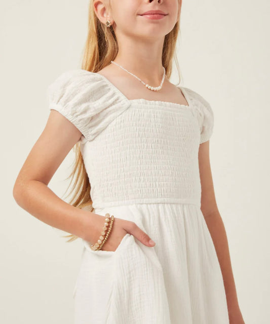 TEXTURED PUFF SLEEVE SMOCKED DRESS - IVORY