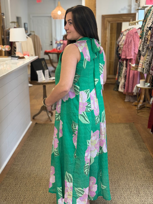 MIX PRINTED SHORT SLEEVE DRESS WITH TIE WAIST - GREEN MIX