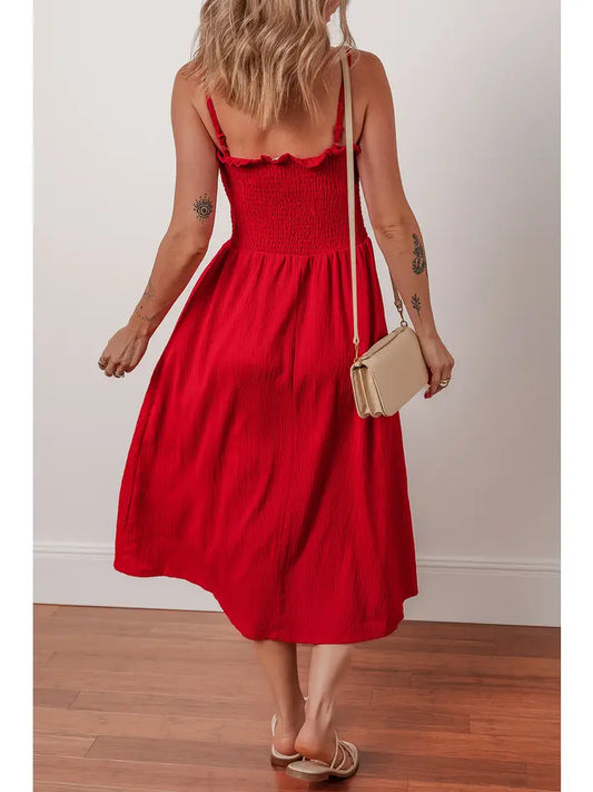 TEXTURED SHIRRED RUFFLED TRIM MIDI DRESS - RED