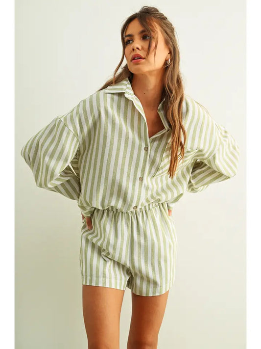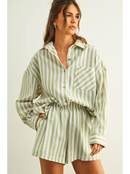 STRIPED BUTTON DOWN LINEN SHIRT - SAGE