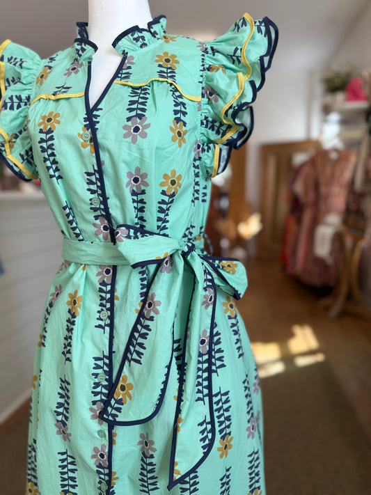 FLORAL FLUTTER SLEEVE MIDI DRESS - MINT