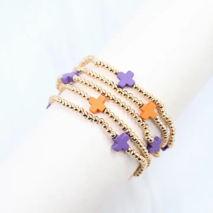 Show off your school spirit with the Brittany Cross Bracelet Set in Purple and Orange! These stretchy gold beaded stacking bracelets feature vibrant solid-colored crosses, adding a fun and stylish touch to any outfit. Perfect for layering or wearing solo, they’re the ideal way to celebrate your pride with a playful flair.