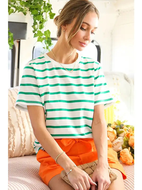 CREW NECK SHORT-SLEEVE STRIPED PRINT KNIT TOP - GREEN