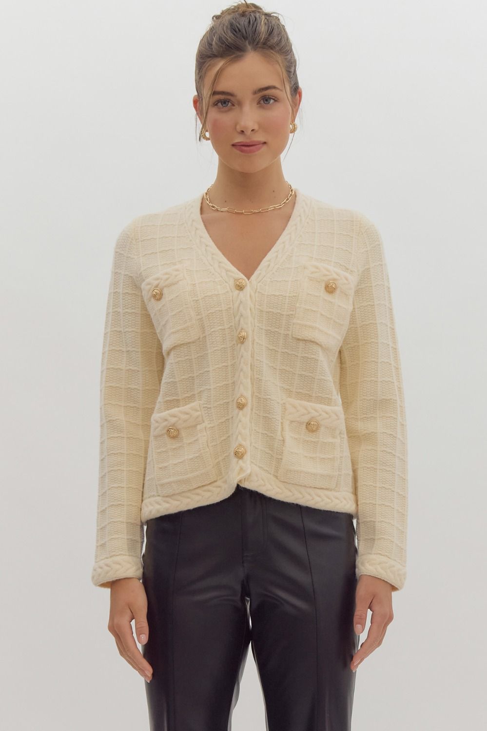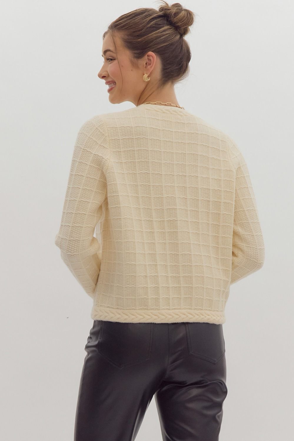Textured long sleeve button up cropped knit cardigan featuring pockets at front. Unlined. Knit. Non-sheer. Lightweight.