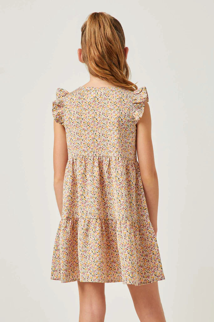 FLORAL RUFFLE TIERED SLEEVELESS DRESS - BLUSH