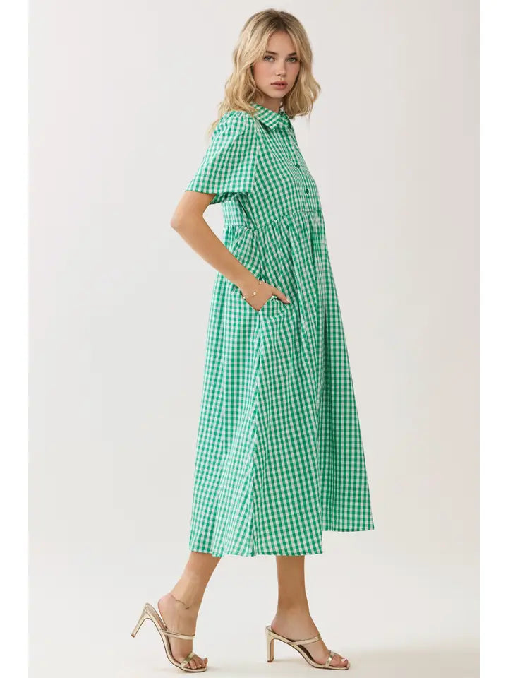 GINGHAM BUTTON FRONT BABYDOLL MIDI DRESS - GREEN