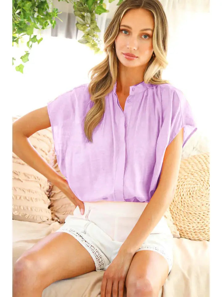 HENLEY NECKLINE BUTTON DOWN SHORT SLEEVE TOP - LAVENDER