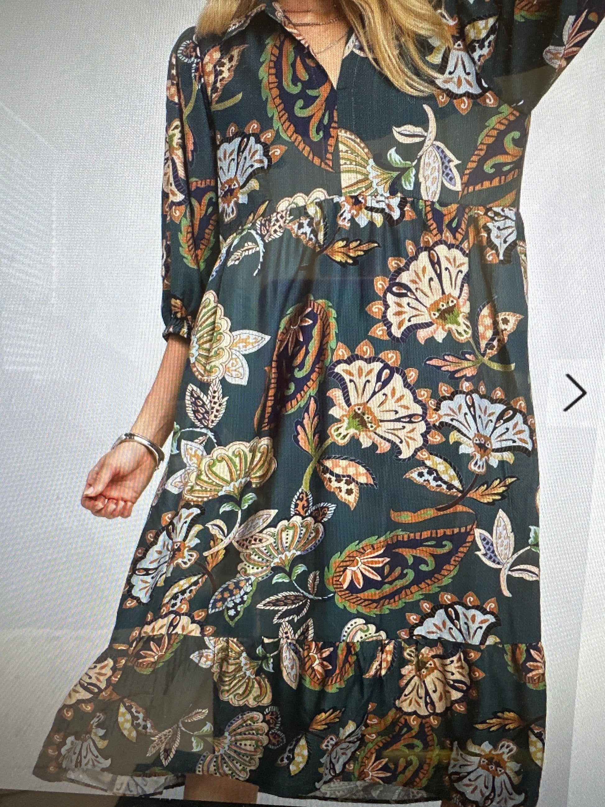LINING PRINTED COLLARED MIDI DRESS - TEAL