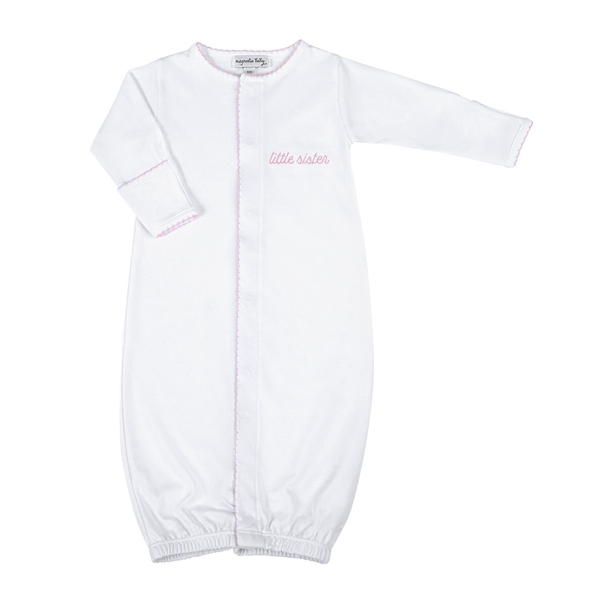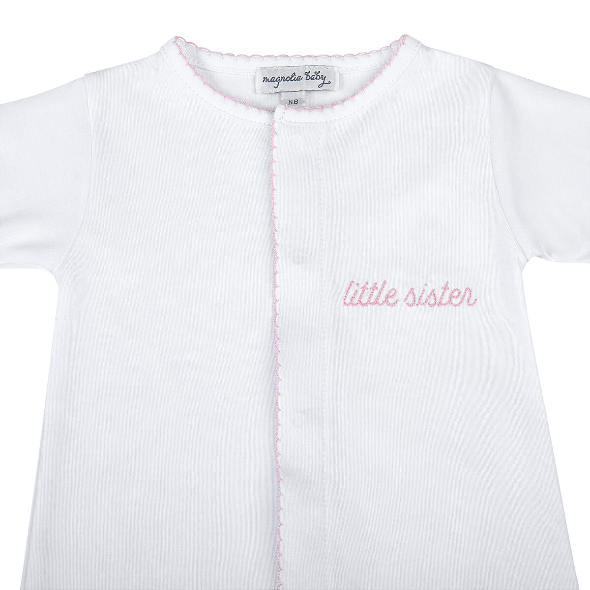 Meticulously hand-embroidered on premium Pima cotton, this Magnolia Baby converter is a testament to artistry and love. The delicate 'Little Sister' inscription makes it a unique gift to welcome a new addition. Its versatility and comfort will be treasured for years to come.