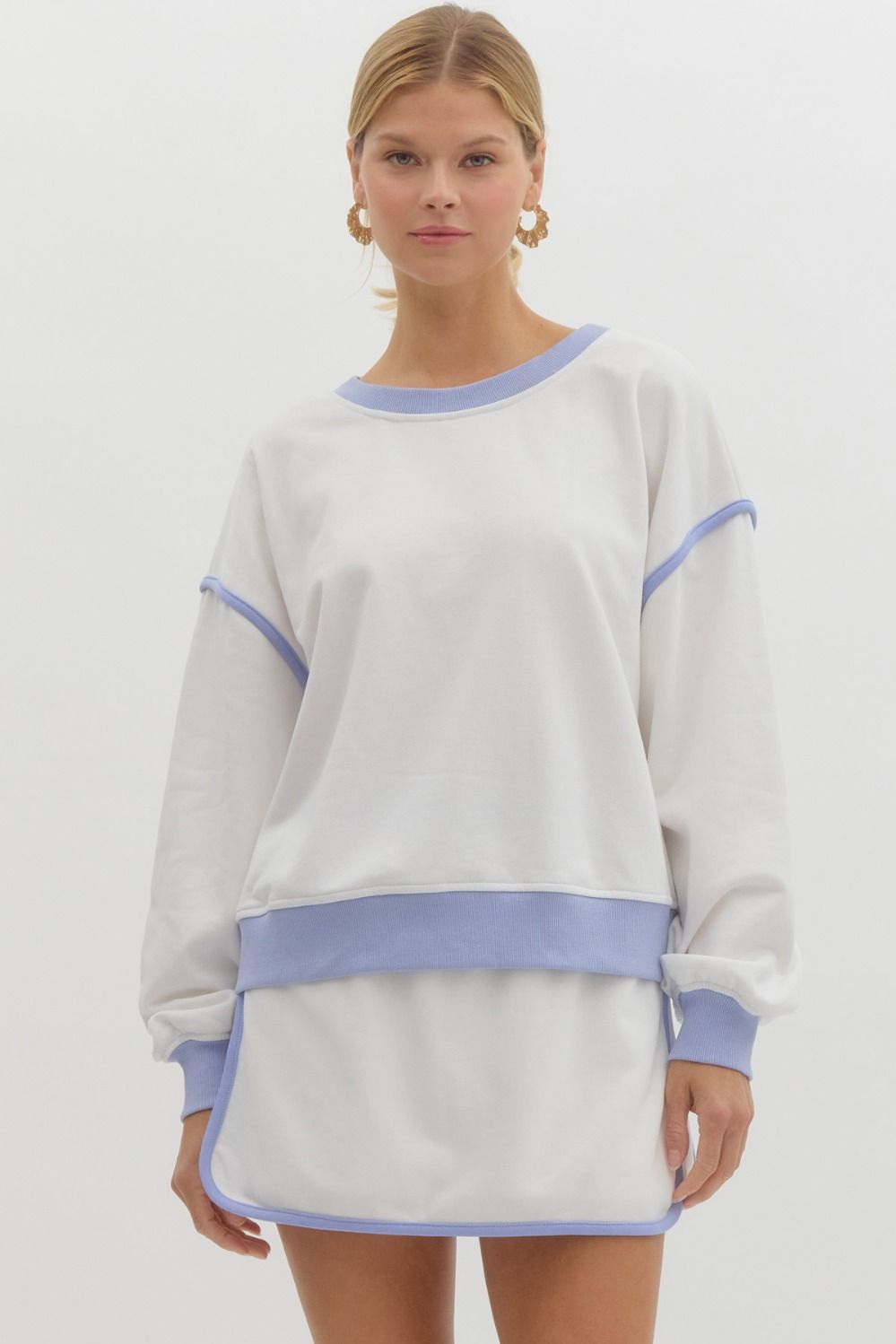 Solid round neck long sleeve top featuring contrasting trim. Unlined. Knit. Non-sheer. Lightweight.