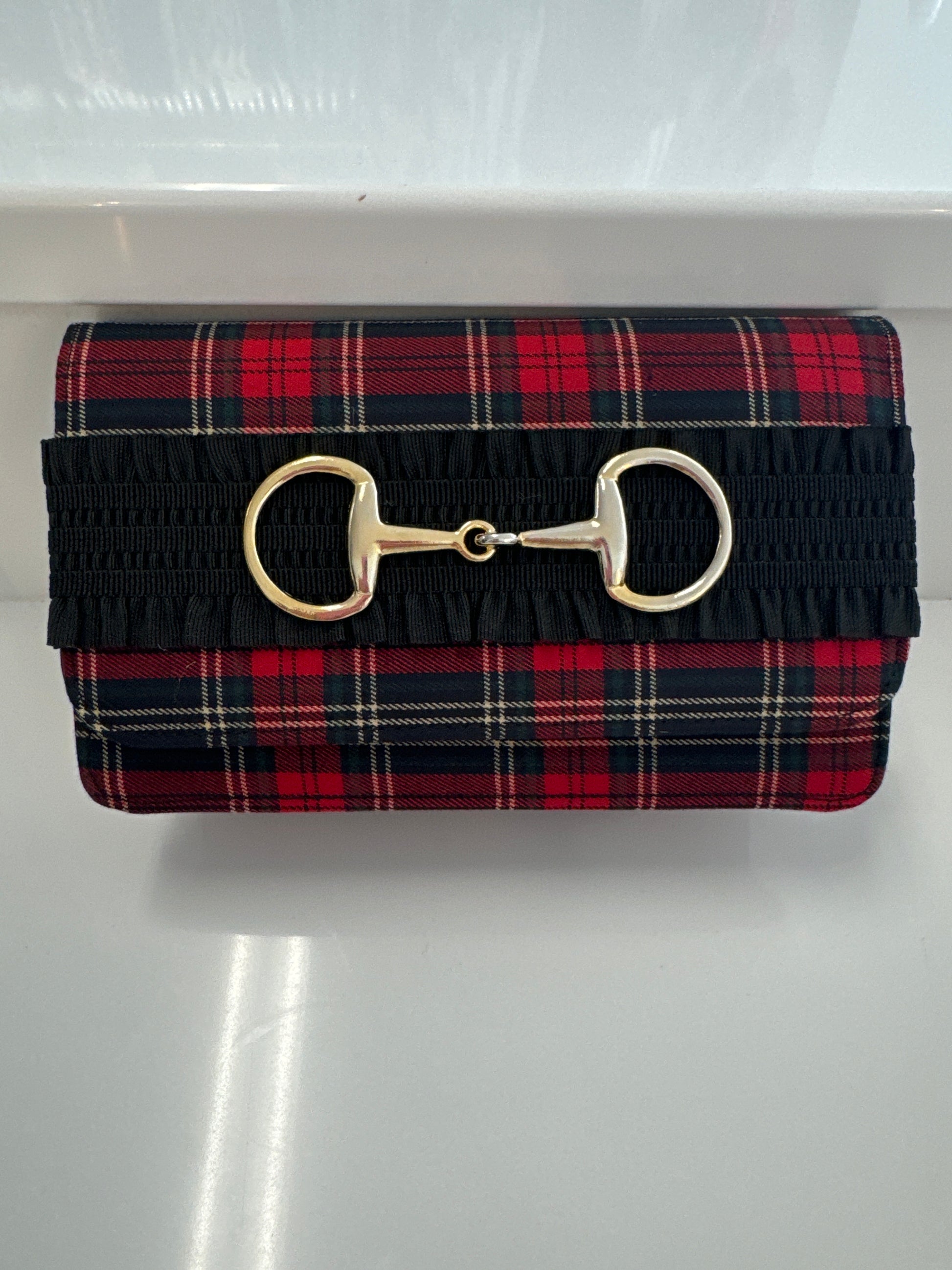 RUBY RED PLAID CLUTCH - BLACK RUFFLE BAND