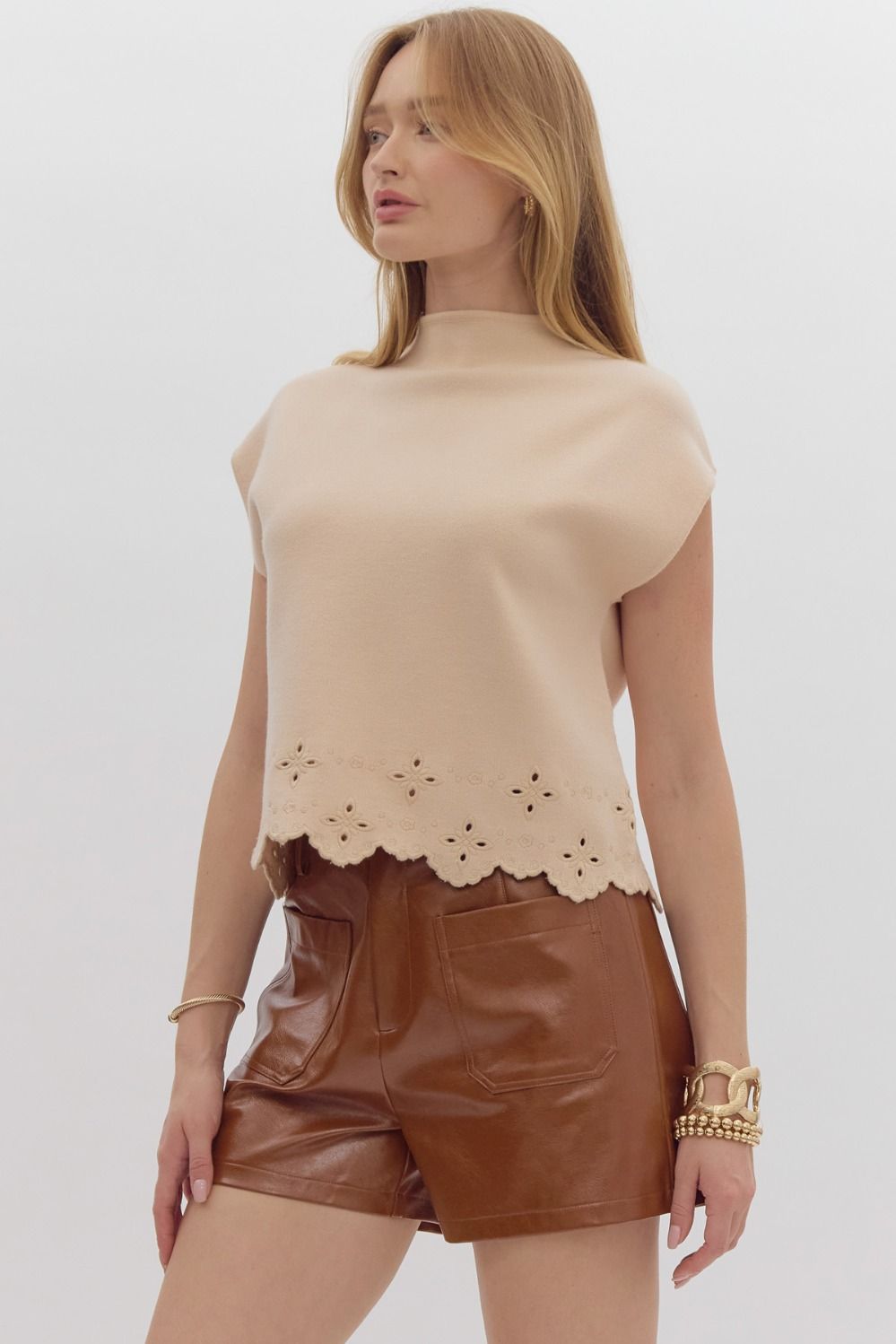 Solid mock neck sleeveless sweater top featuring laser cut with embroidery detail. Scalloped hem. Unlined. Knit. Non-sheer. Lightweight.