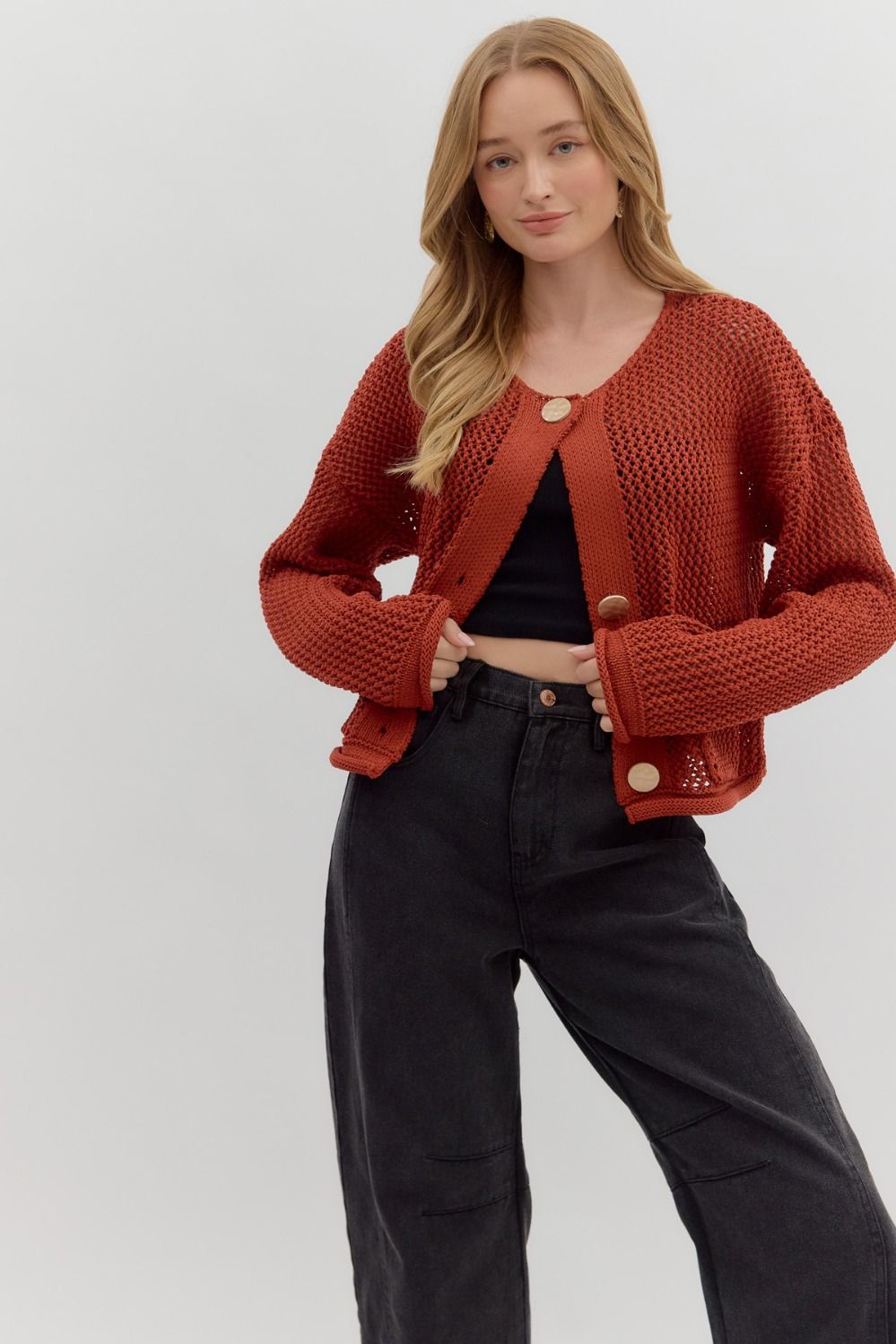 SOLID SWEATER KNIT CARDIGAN W/OVERSIZED BUTTON - RUST