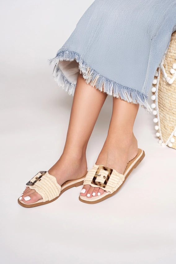 TORTOISE BUCKLE SCALLOP RAFFIA SLIDE - NATURAL