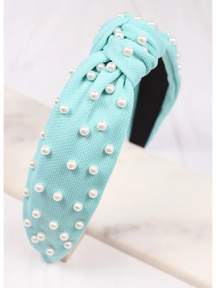 This soft headband has a slightly textured fabric with a top knot accent and pearl accents. The interior has a satin feel material.